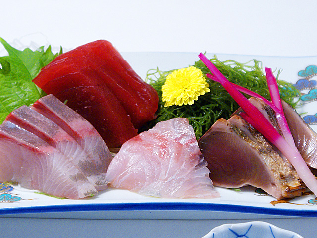 新鮮な鯵(アジ)は、たたき・なめろう・たたきなますで。鮪(マグロ)・カンパチ・鰹(かつお)・イカのお刺身は盛り合わせ、姿造りの舟盛りでご賞味ください。
